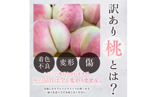 中には着色不良や変形、傷などの訳あり桃も含まれますが、味の品質は全く変わりませんので、安心してご賞味いただけます。冷凍したりアレンジスイーツに使ったり、自分に合ったオリジナルの食べ方でお楽しみください。